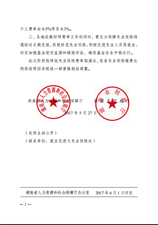 湖南省人力资源社会保障厅、湖南省财政厅关于阶段性降低全省失业保险费率有关问题的通知