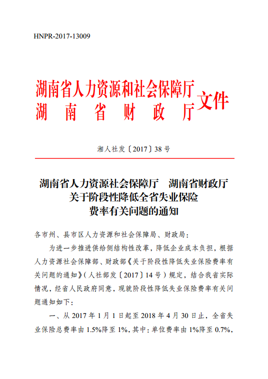 湖南省人力资源社会保障厅、湖南省财政厅关于阶段性降低全省失业保险费率有关问题的通知